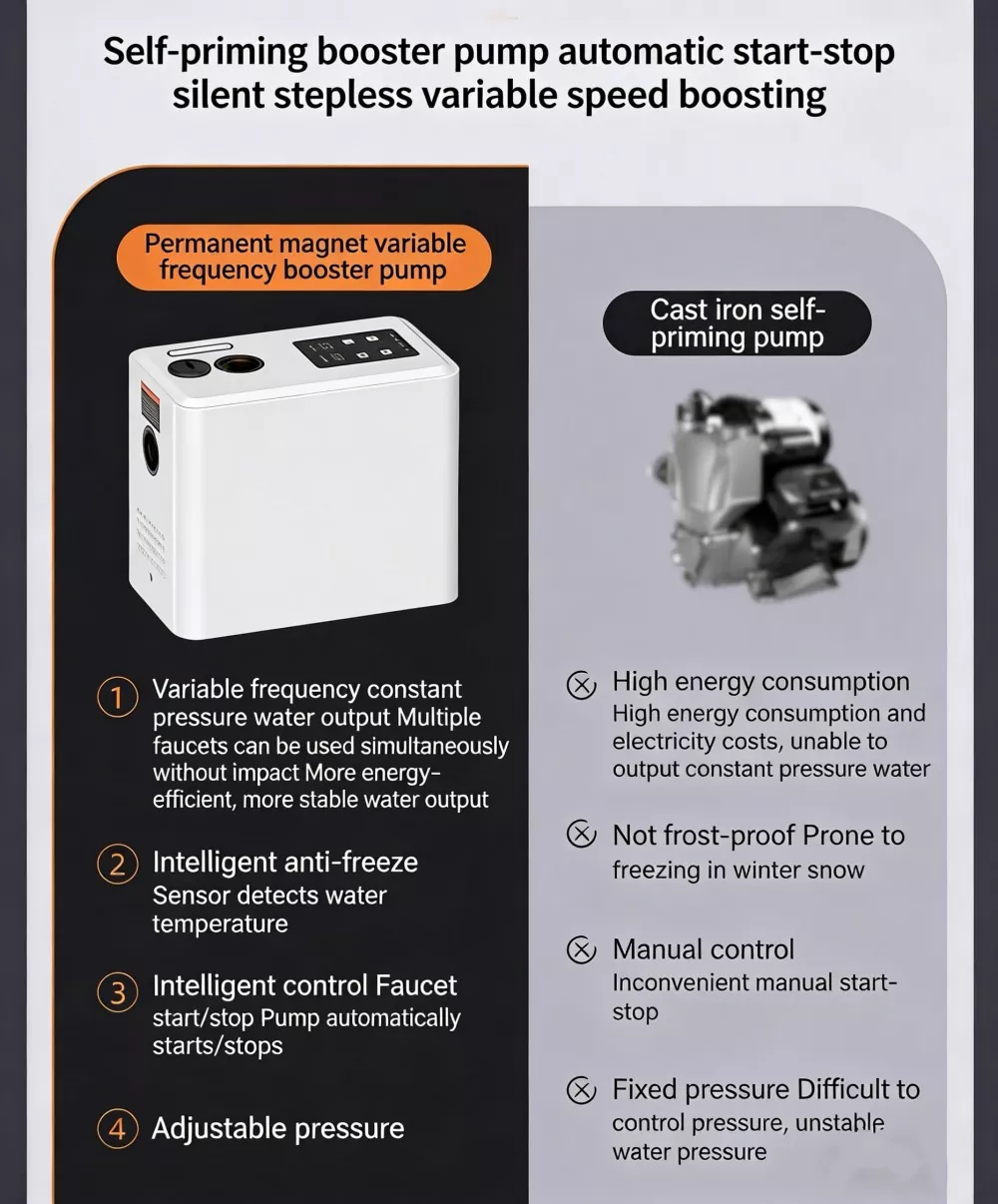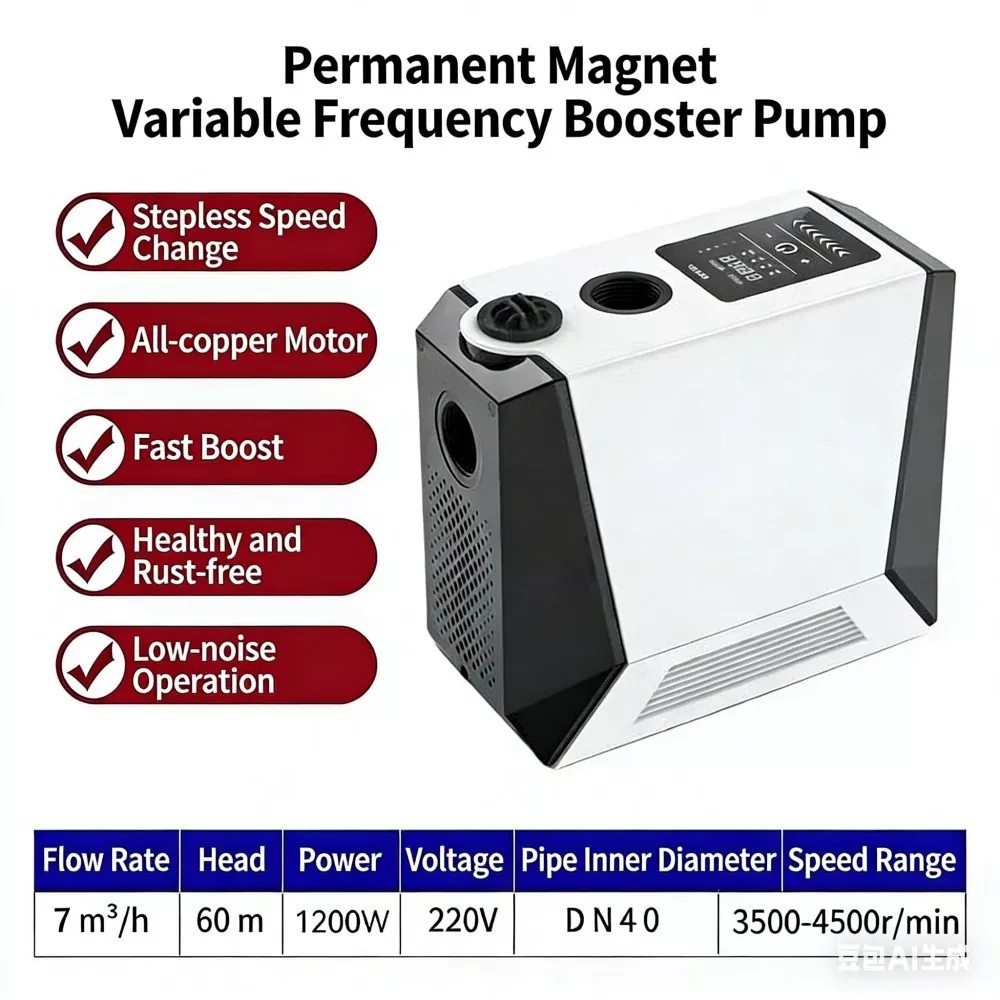 उच्च गुणवत्ता वाले घरेलू जल दबाव बढ़ाने वाले समाधान की तलाश में, स्थायी चुंबक परिवर्तनीय आवृत्ति बूस्टर पंप आपकी बेहतर पसंद है। बाजार में सामान्य बूस्टर पंपों की तुलना में, हमारा उत्पाद पूर्ण बुद्धिमान नियंत्रण प्रणाली, स्थिर चर आवृत्ति निरंतर दबाव फ़ंक्शन, अल्ट्रा-लो शोर ऑपरेशन डिज़ाइन, हाई-स्पीड हाई-पावर मोटर, बुद्धिमान एंटी-फ़्रीज़ सुरक्षा और कॉम्पैक्ट स्टाइलिश उपस्थिति से लैस है। यह पारंपरिक पंपों की सामान्य कमियों को पूरी तरह से हल करता है, जैसे बोझिल मैनुअल ऑपरेशन, अस्थिर पानी का दबाव, उच्च परिचालन शोर, सर्दियों में आसान ठंड क्षति, और भारी और कठिन स्थापना।