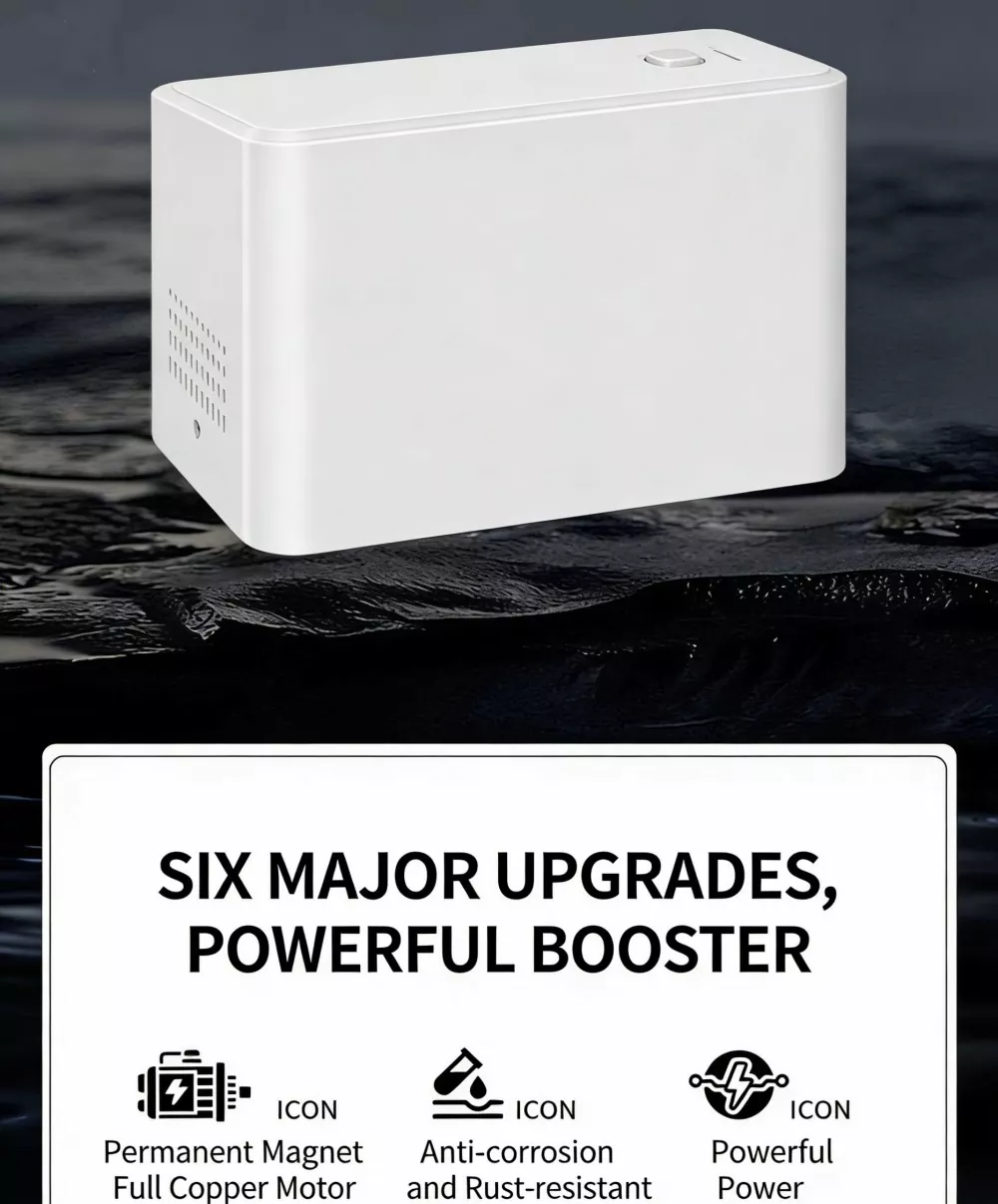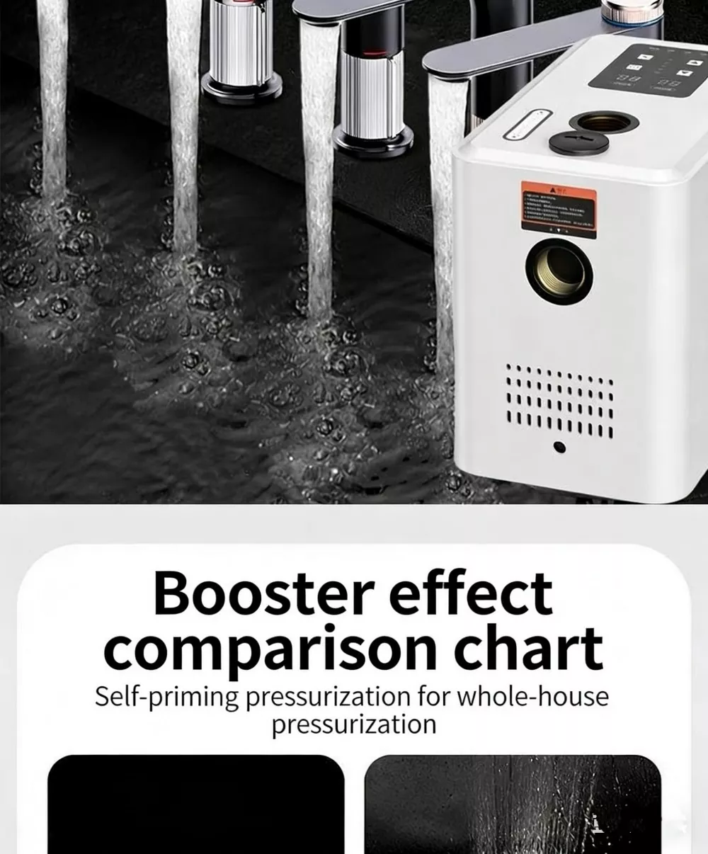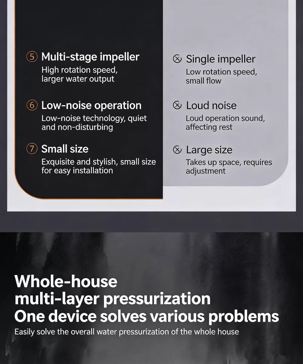हाई-स्पीड मोटर: अंतर्निर्मित 6500 आरपीएम हाई-स्पीड मोटर बढ़ती शक्ति लाती है, मजबूत और स्थिर बड़े प्रवाह वाले पानी का उत्पादन प्रदान करती है, और अपर्याप्त घरेलू पानी के दबाव की समस्या को पूरी तरह से हल करती है।