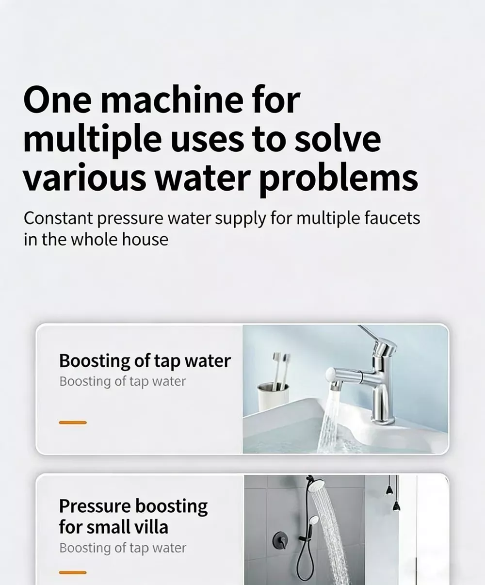 परिवर्तनीय आवृत्ति और लगातार दबाव: स्थिर पानी के दबाव को लगातार बनाए रखने के लिए उन्नत परिवर्तनीय आवृत्ति ड्राइव तकनीक को अपनाता है। यहां तक कि जब एक ही समय में कई पानी के नल उपयोग में होते हैं, तो यह अचानक दबाव में उतार-चढ़ाव पैदा नहीं करेगा, जिससे पूरे घर के लिए स्थिर पानी की आपूर्ति सुनिश्चित होगी।